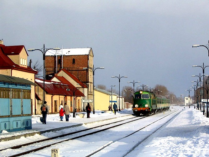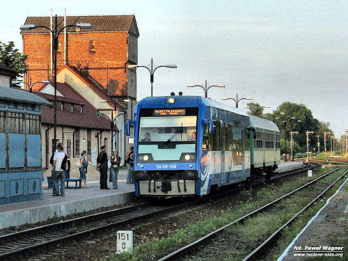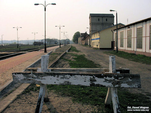 budynki dworca, na niebiesko pomalowane zejścia do przejścia podziemnego pod torami |