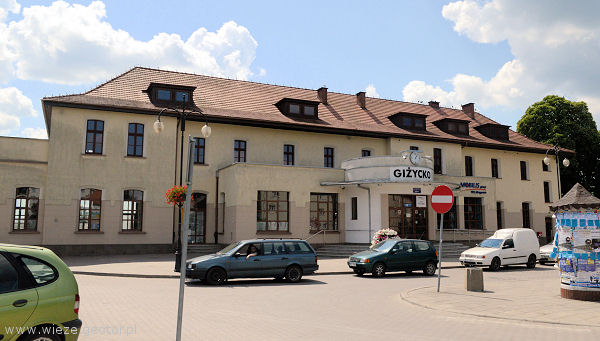 | Giżycko - budynki dworca, wieża wodna, wody jeziora Niegocin |