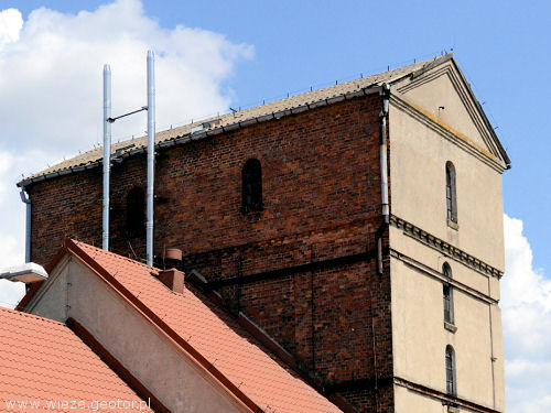 wieża latem 2014 r. poszczególne kondygnacje są wyraźnie zaznaczone w zewnętrznym kształcie budowli |