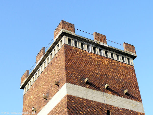 Wieża wybudowana na planie kwadratu, ceglana, z żelbetowym wieńcem poniżej kondygnacji zbiornikowej.
