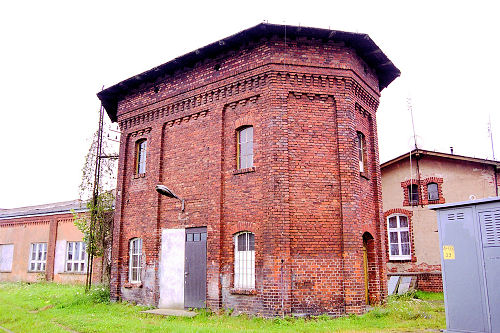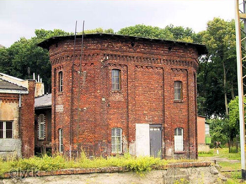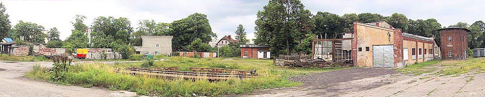| ujęcie panoramiczne: wieża po prawej stronie, w centrum obrotnica lokomotywowni, a lokomotywowni - juz nie ma (lipiec 2005 r.) |