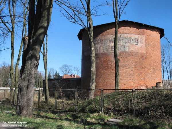 Cylindryczna wieża ciśnień na stacji kolejowej w Biskupcu. Stacja została oddana do użytku w roku 1898, wieża przypuszczalnie pochodzi z tego samego okresu.