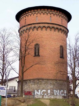 Monumentalna wieża ciśnień zbudowana jest z czerwonej cegły, wznosi