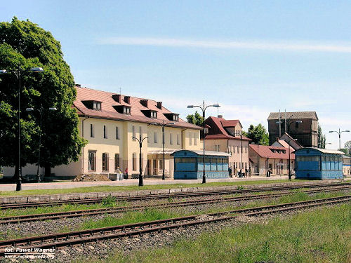budynki dworca, na niebiesko pomalowane zejścia do przejścia podziemnego pod torami |
