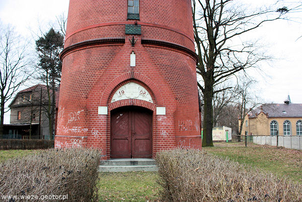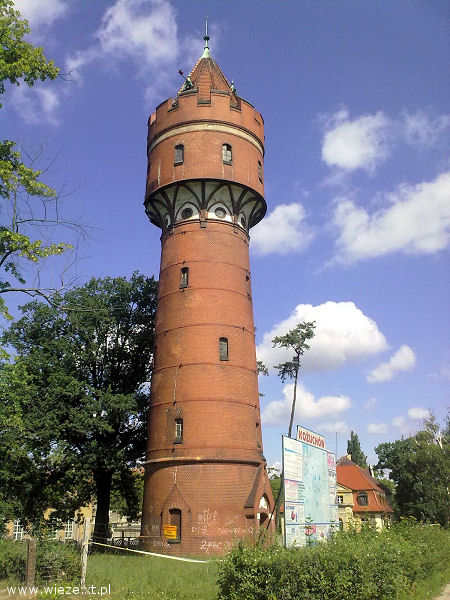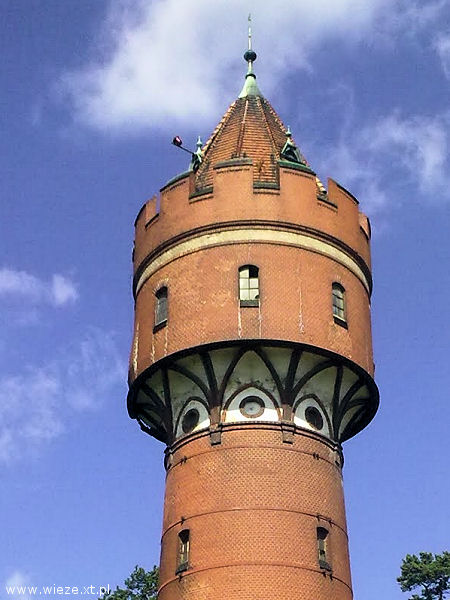 Wieża wybudowana na planie koła, w roku 1908, posiada zbiornik typu Intze.
