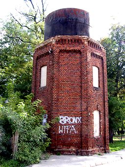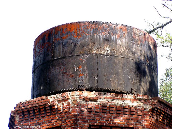 destrukcji, odsłaniając stalowy, nitowany zbiornik na wodę.
