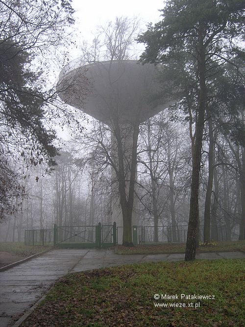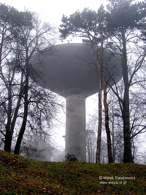 Wodociągowa wieża ciśnień Współczesna wieża o konstrukcji żelbetowej, zlokalizowana chyba w najwyższym punkcie Mrągowa, na osiedlu Brzozowym. zdjęcia: Marek Patakiewicz (listopad 2006 r.) ... mgła ...
