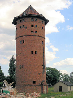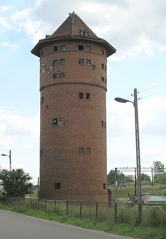 Kolejowa wieża ciśnień Obiekt imponujący pod względem rozmiarów, pochodzi z czasów II wojny światowej zdjęcia: Marek Patakiewicz (lipiec 2006) widok od strony ulicy widok od strony torów, po lewej stronie - wynik prac rozbiórkowych budynku pompowni.