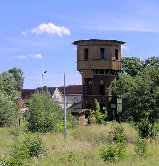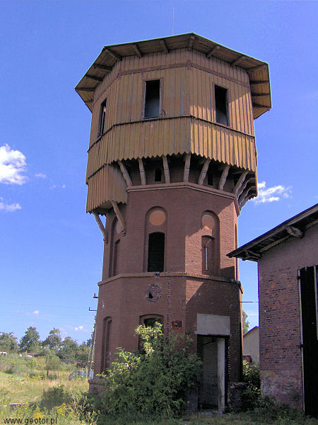 Kolejowa wieża ciśnień Wieża znajduje się obok nieczynnej lokomotywowni, wybudowana wg typowego wzoru. Posiada zachowany zbiornik wodny z dobrze utrzymaną drewnianą obudową. Zdjęcia: Mariusz Skrętkowicz (sierpień 2008) fot. Mariusz Skrętkowicz widok od strony wejścia dobrze zachowana drewniana konstrukcja głowicy wieży