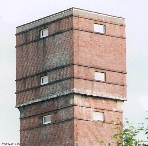 Wieża zbudowana z czerwonej cegły, zbiornik - przypuszczalnie żelbetowy.