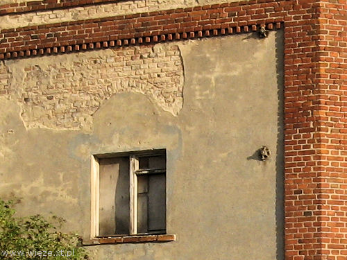 | okno w drugim wcieleniu, | poniżej okna uwagę zwracają cegły - inne w kształcie, inaczej ułożone i o innej odporności na przemarzanie - świadectwo przebudowy |