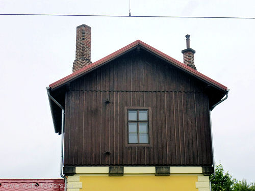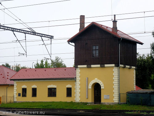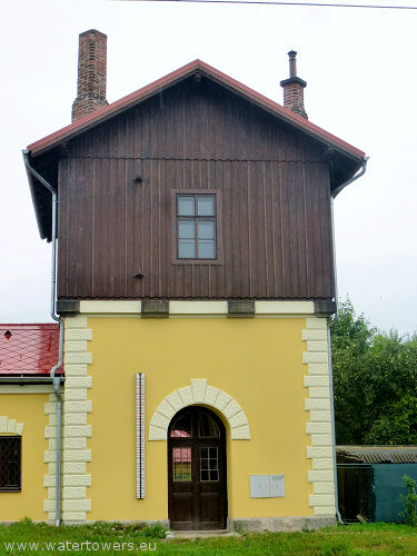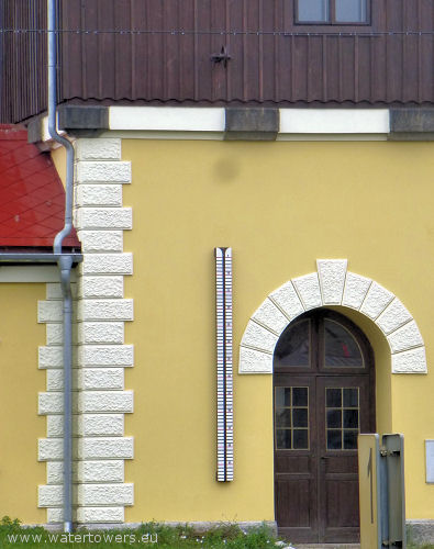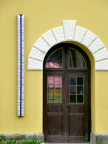 | Benešov, kolejowa wieża wodna oraz listwa wodowskazu przy drzwiach | ||