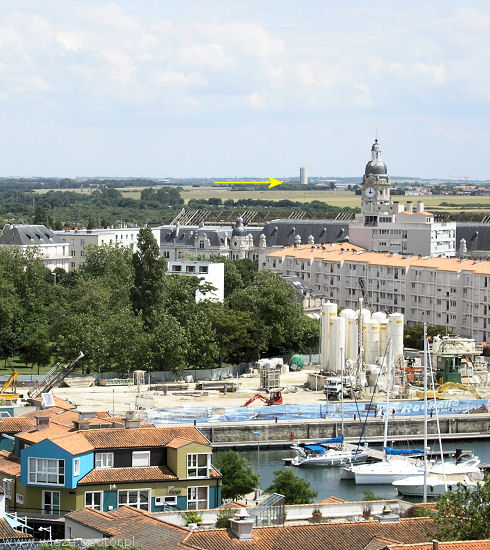 wieża prawie na linii horyzontu, widok z portu w La Rochelle, z wieży Św. Mikołaja |