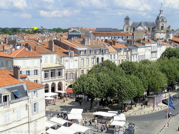 Mikołaja z portu w La Rochelle wieża na linii horyzontu (żółta strzałka) |