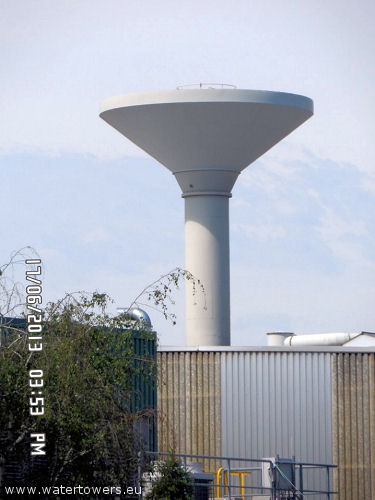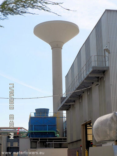 Zakładowa wieża ciśnień stoi wśród zabudowy przemysłowej przy Hans