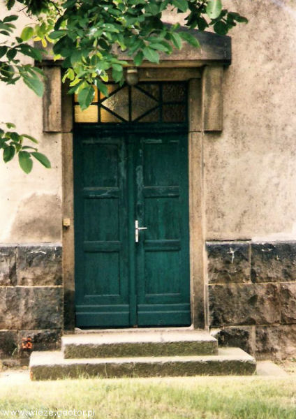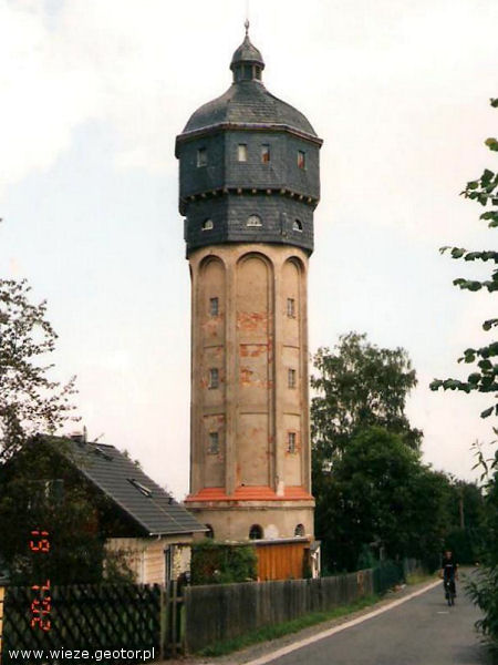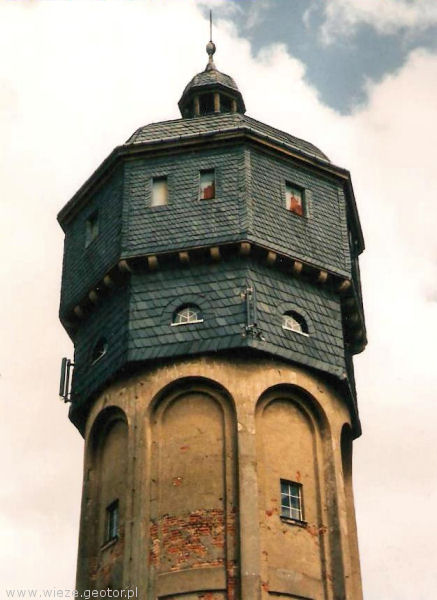 Siebenlehn, górne kondygnacje wieży głowica obłożona łupkiem, na zdjęciu widać też ceglane wypenienie konstrukcji wieży |