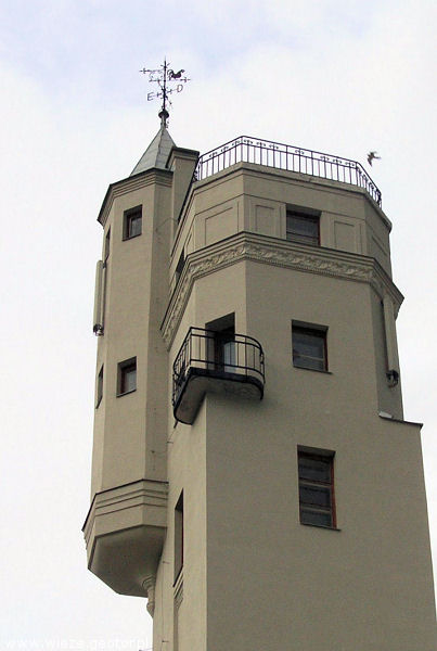 | głowica wieży z przybudówką zawierającą spiralne schody prowadzące ponad zbiornik i na taras widokowy |