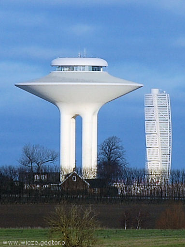 budowla, zbudowana w dzielnicy Västra Hamnen, ma 190 m wysokości w tle po lewej - wiatrak |